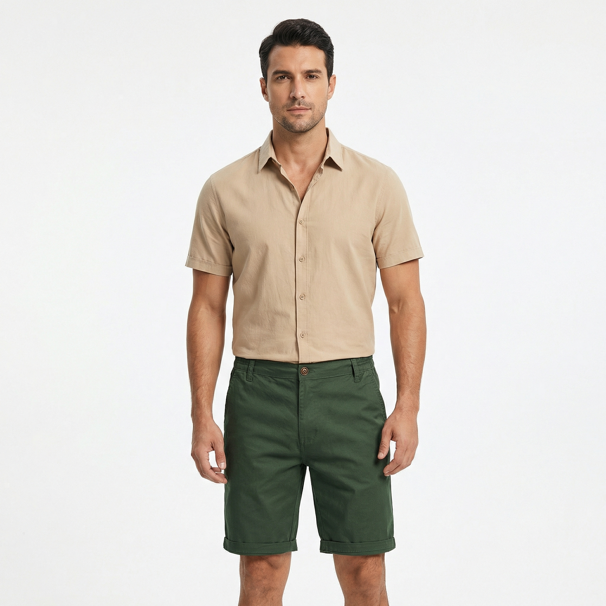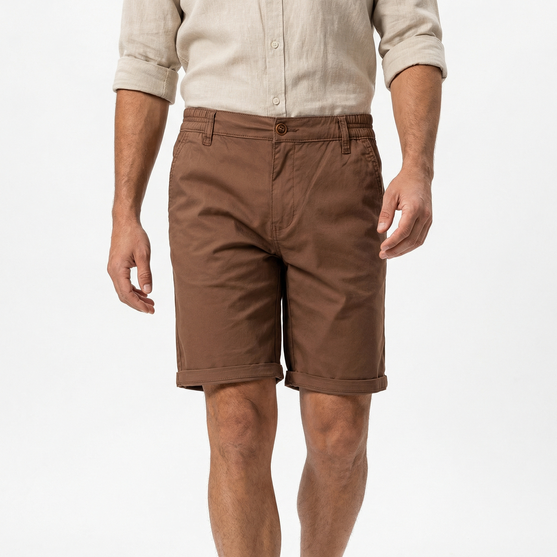 These cotton shorts for men are designed for clean everyday style and warm weather comfort. Featuring a front button closure with an elastic back waistband, rolled hem finish, and a lightweight cotton construction, they offer a polished yet relaxed look for spring and summer.